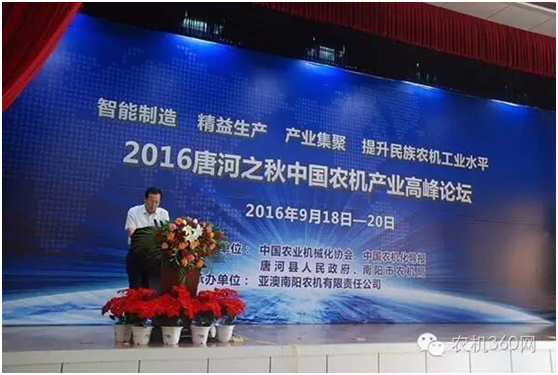 9月20日,由中國(guó)農(nóng)業(yè)機(jī)械化協(xié)會(huì)、《中國(guó)農(nóng)機(jī)化導(dǎo)報(bào)》、河南省唐河縣政府和南陽(yáng)市農(nóng)機(jī)局共同主辦,亞澳南陽(yáng)農(nóng)機(jī)有限責(zé)任公司承辦的2016唐河之秋中國(guó)農(nóng)機(jī)產(chǎn)業(yè)高峰論壇在河南省唐河縣舉行。全國(guó)各地農(nóng)機(jī)生產(chǎn)企業(yè)、當(dāng)?shù)亟?jīng)銷商以及媒體代表共200多人參加了此次論壇。
